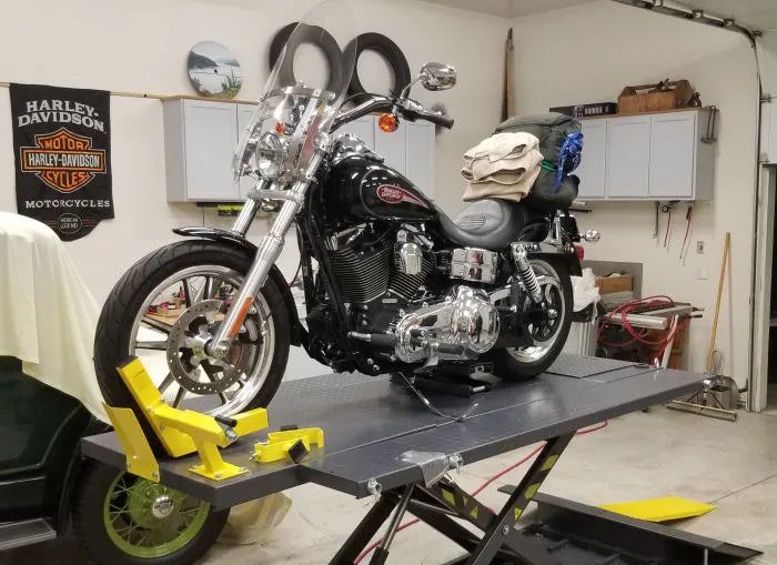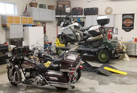 The motorcycle lift is here and already has had several bikes on it within the first hour. I have included two pics with my '03 Ultra on the lift. Thanks for a great product and I look forward to doing more business with you in the future".