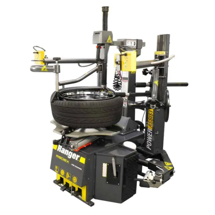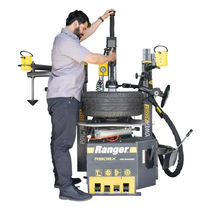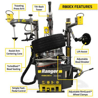 The Ranger R80EX tire changer features a dual-assist, tilt-back tower design, so it's outfitted with the industry's best and most powerful tools. With the R80EX, you get the classic, rugged reliability Ranger is known for, plus dozens of standard features including Bilateral Power Bead Loosener, RimGuard Technology, and TargetBlast Bead Seating.
