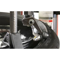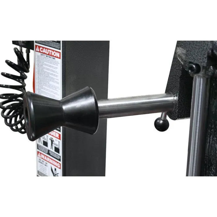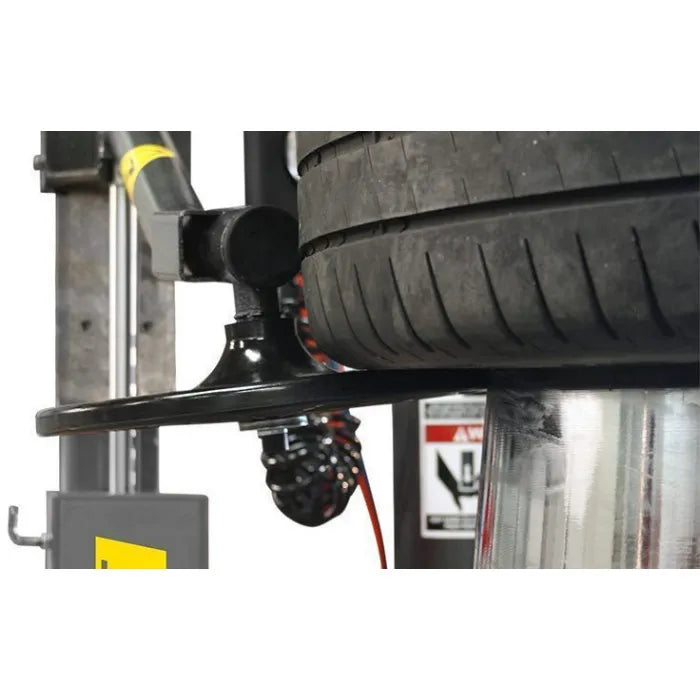 Right-side assist tower features a multi-profile traveling drop-center tool that holds stubborn sidewalls in the drop-center area of the wheel for swift, precise mounting. A single lower-bead lifting disc can be used to unseat stubborn lower beads or to elevate tires for tool placement. A power-drop top bead assist roller helps hold difficult top beads in place during removal and in installation of tough sidewall tires. These important tire shop tools dramatically reduce the effort required to change difficult, low-profile tires and help minimize operator fatigue. Upfront trigger control and articulating arm allow for variable tire and wheel configurations. A heavy-duty, tri-flange, cast-iron assist tower carriage features linear way bearings for maintenance-free operation.