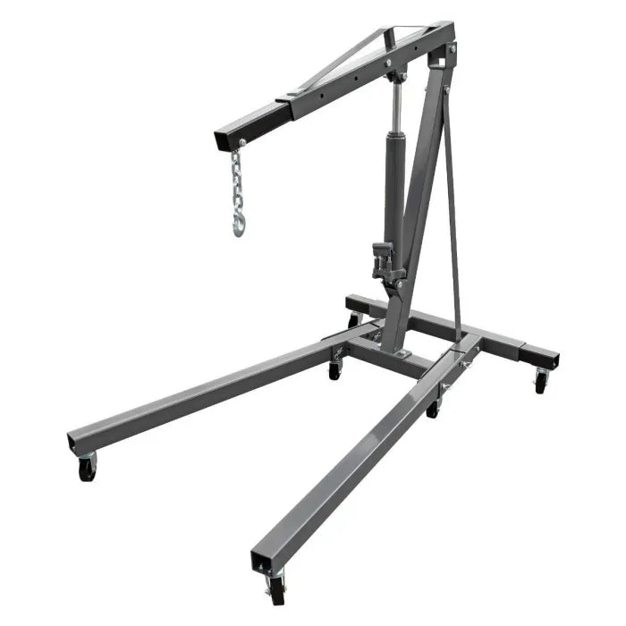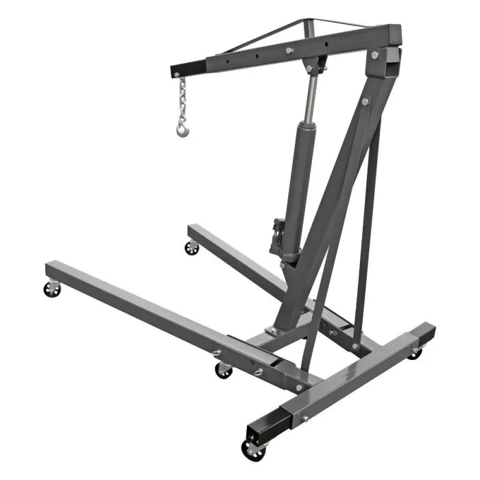 The Ranger RSC-2TF 2-Ton Folding Shop Crane is a hydraulic folding engine hoist that is perfect for auto shops that have limited floor space but still want the lifting capabilities of an engine crane.Rugged, 4,000-lb. Capacity Folding Crane The RSC-2TF 2-ton folding shop crane sports a 1" to 93" lifting range and features a 4-hole position boom, rugged hydraulic ram, 6-wheel design for added mobility and foldable body. With such a high range, this shop crane can be used to hoist engines whether your vehicle is on the ground or raised on a super-tall car lift. Quick-release ring pins make setup and teardown a snap. Heavy steel construction ensures maximum durability, and the 4-position boom is reinforced, so flex is never an issue. With a powerful, 4,000-lb. shop crane at your disposal, you'll be better-suited to lift and secure heavy-duty engines than your competition. The impressive portability of the crane is just an added bonus. Its steel casters are robust and safe for shop environments. Safety brakes are built into the front casters to prevent movement while the crane is in action. Even when the shop crane arm is extended, the stable base allows operators to rotate the unit without it sliding out of place—that's all due to Ranger's superior engineering and carefully considered center of balance. Ergonomically placed removable handle makes it easy to pump the crane to its full extension, and a simple twist of the lever lets the crane effortlessly descend into its ready-to-fold position. If you've ever used a hydraulic floor jack before, the shop crane is just as safe and easy to use, and the lifting principle is the same. Once the job is done and the crane is folded, simply roll the RSC-2TF out of the way until the next time you need it.