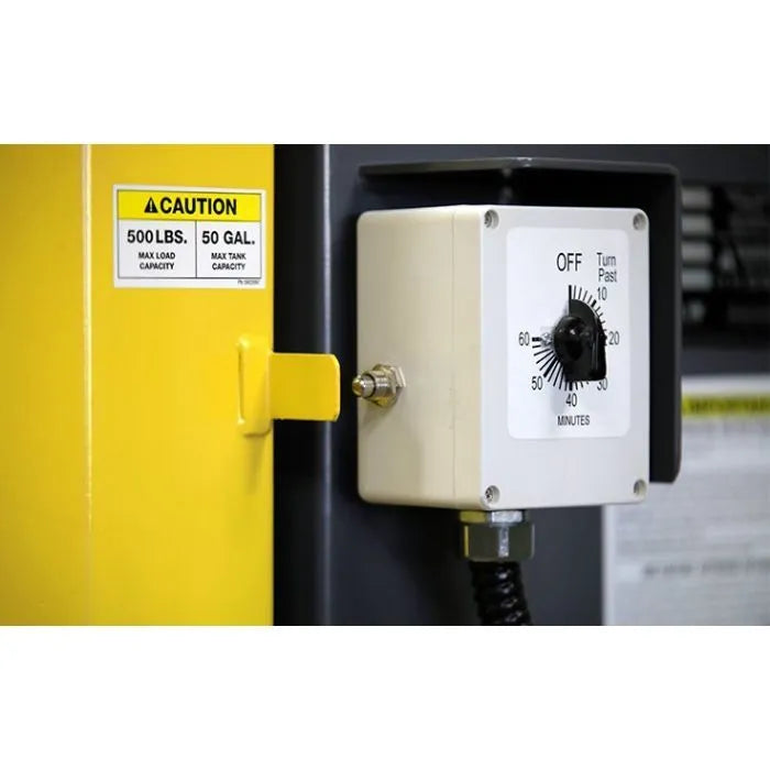 A sealed, water-resistant, NEMA-rated electrical box plays a critical role in electrical management of the parts washer. A well-organized electrical system features easily identifiable circuits for the control breakers, water tank thermostat and timers for both oil skimmer and turntable operation. Smart circuitry prevents nuisance breaker tripping and enhances overload/overheat detection and protection. A proprietary audible and visual alarm activates when the low-water sensor detects unsafe operating conditions. When water levels are too low, the washer will remain inoperable until the water level is restored and the button reset by the operator.