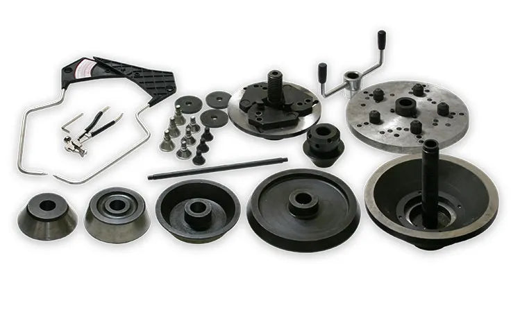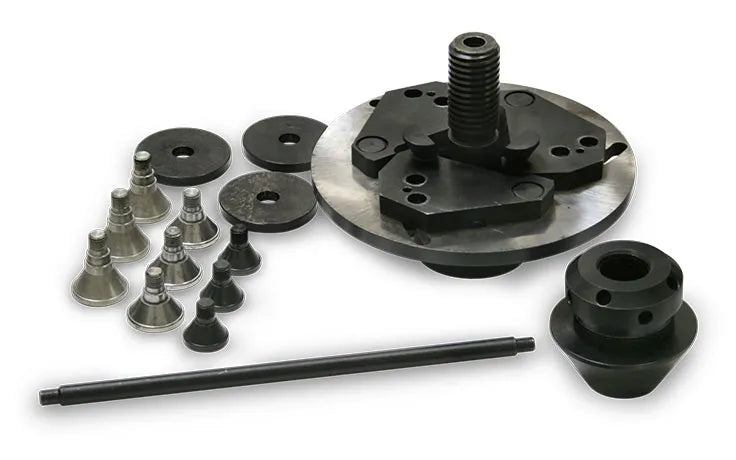 A universal flange plate kit features multi‐position interchangeable pins to provide quick setup and universal fitment. The kit adapts to varying lug bolt circles.