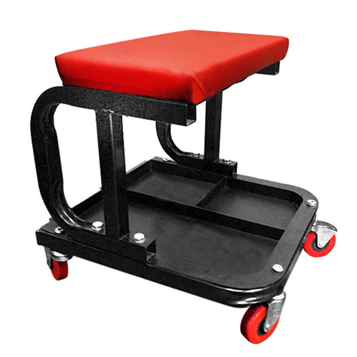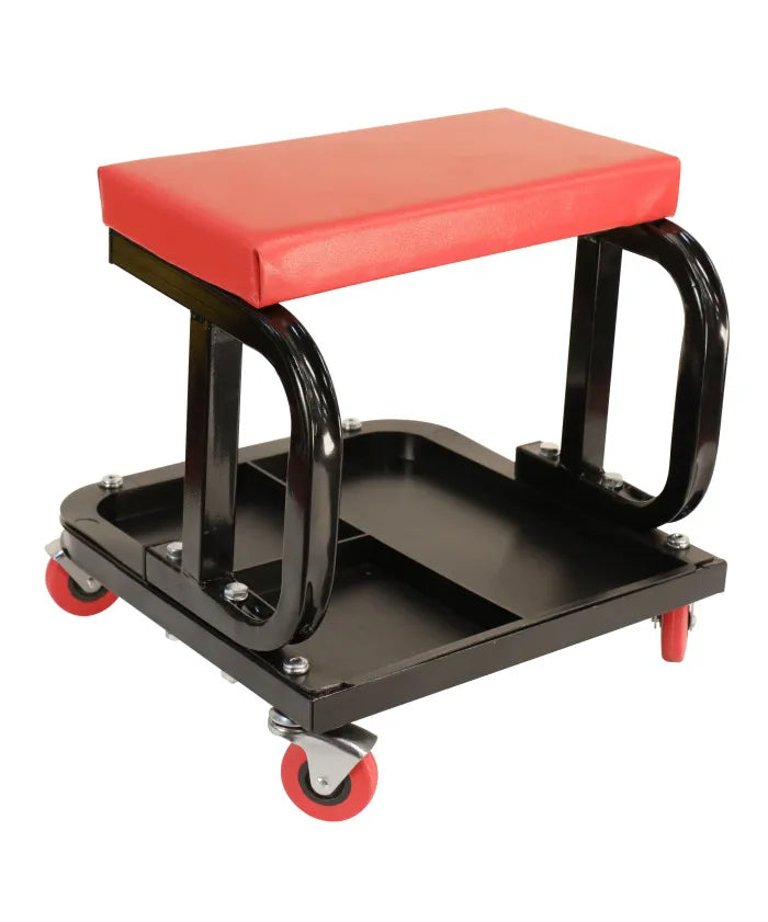 The Ranger RST-1WS is a portable, rolling work seat that glides smoothly across garage floors to allow for easy, trouble free movement when performing work with four ball-bearing casters. The seat is padded for comfort and features as convenient tool tray underneath the seat.More Comfort, Better Posture Working Around QuickJack If you're working on a project for long periods of time, you may want to consider the toll it puts on your body. Working in a comfortable, upright position off your feet reduces stress and allows you to do your best work. That's where the Ranger Products® RST-1WS Rolling Work Seat comes in. This rolling work seat reduces back strain and features an integrated tool tray that's located just under the padded cushion and stays with you no matter where you go. If you're already in the business for a QuickJack car lift, consider adding a work seat to your order, especially if you or your fellow mechanics prefer working closer to the ground. Reinforced red vinyl stretched over a hardy foam pad comprises this comfy cushion to take the pressure off your back. At the same time, the convenient under-seat tray makes sure all of your tools are always just a short reach away. Sturdy, 1" steel tubing construction and ball bearing swivel casters ensure you'll be rolling in style for a good long while. Go ahead, ditch that busted old work seat and upgrade to the apex of service equipment design and comfort.
