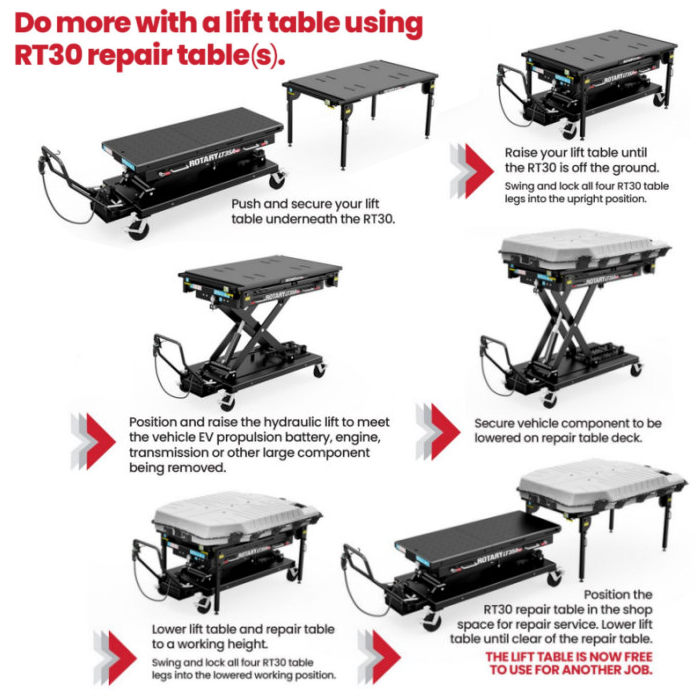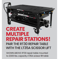 Pair the LT35A lift table with patent-pending RT30 repair table to create multiple workstations allowing technicians to use the lift table for other jobs. The 3,000 lb. capacity RT30 mounts on top of the lift table to operate as a fixture to support the removal of heavy vehicle components and can be lowered by the LT35A to its legs to serve as a repair table, freeing the lift table to be used for the next job. Use numerous RT30 repair tables with a single LT35A lift table and reduce the need for and expense of multiple lift tables.