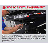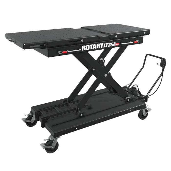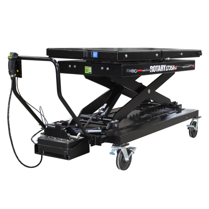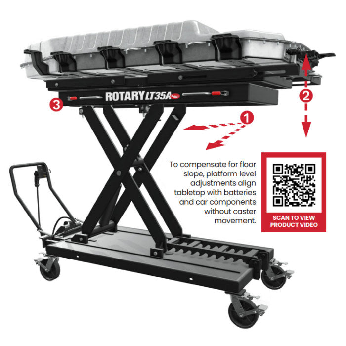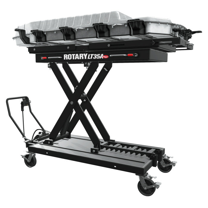 Built by the makers of the world's most trusted vehicle lifts, Rotary's patent-pending LT35A Air Hydraulic Lift Table is designed to handle EV batteries and other heavy vehicle components with ease! The LT35A provides shops with the ultimate in versatility, flexibility and safety while maximizing space, productivity and revenue. Equipped with air-operated mechanics and fortified with mechanical locks, the LT35A ensures smooth and secure lifting operations every time. With its extra-wide base providing unparalleled stability, you can trust the LT35A to keep your workspace steady and secure, even during the most demanding tasks.