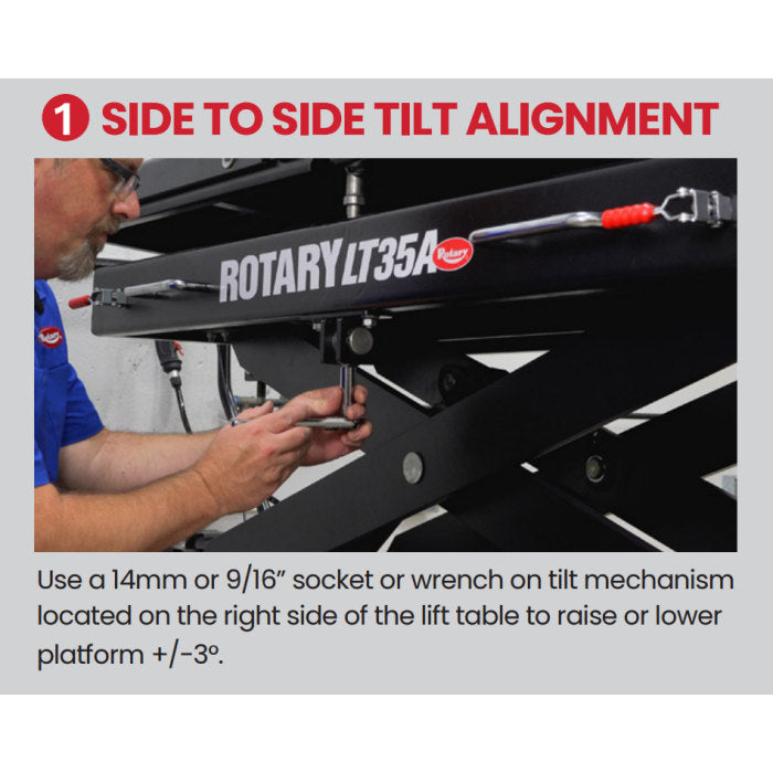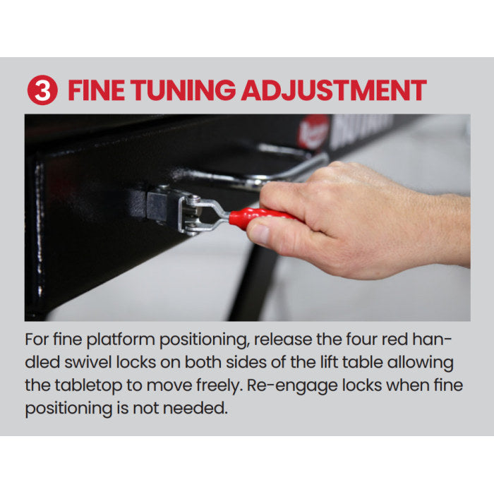 The LT35A lift table offers both side-to-side tilt alignment with fore and aft tilt adjustment and can be positioned while under load with no need to remove battery, parts or tools from the table platform. The lift table's platform can also be adjusted for fine tune positioning and locked into place with swivel locks on both sides of the platform.