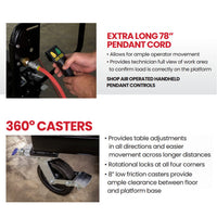 The LT35A lift table is designed with an extra-long, handheld pendant control that allows for easy and comfortable operation and allows the operator to move around and have a clear view of workspace to confirm load is correctly on the platform. Once loaded, the lift table's 8" lockable, 360 degrees, "low friction" casters at all four corners provide ample clearance between floor and base and make it easy to move the table under load.