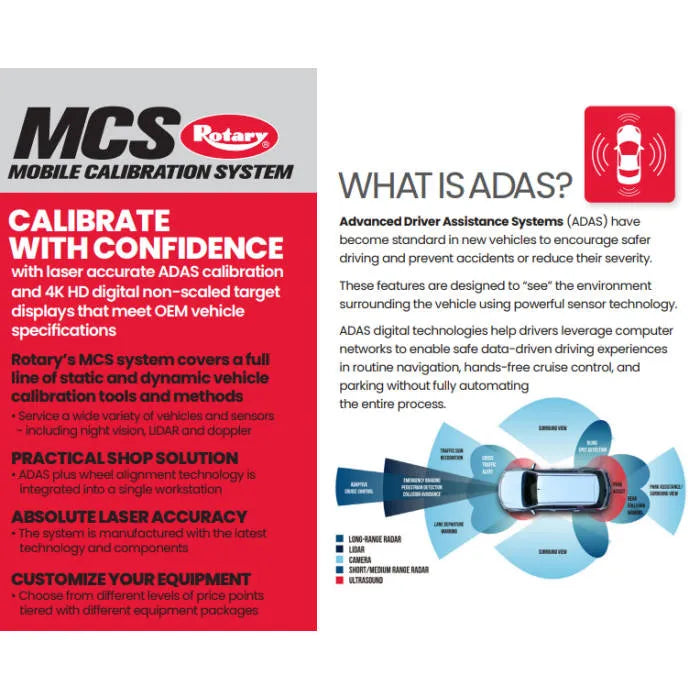 Calibrate With Confidence with laser accurate ADAS calibration and 4K HD digital non-scaled target display that meet OEM vehicle specifications. Rotary's MCS