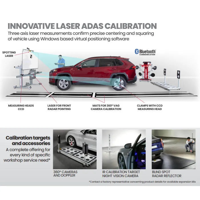 Enjoy fast, accurate, and repeatable lase distance measuring with Rotary's new Mobile ADAS Calibration System. Powered with the latest in Bluetooth technology and a dedicated vehicle-to-software synching PC, the system helps shops meet the demands of OEM vehicle specifications thanks to its advanced, three-axis laser measurements, accurate and speedy millimeter tilt adjustments, pivot screen movements, oversized 360-degree motion casters, and Bluetooth-powered lasers, digital levels, and spotting lasers.
