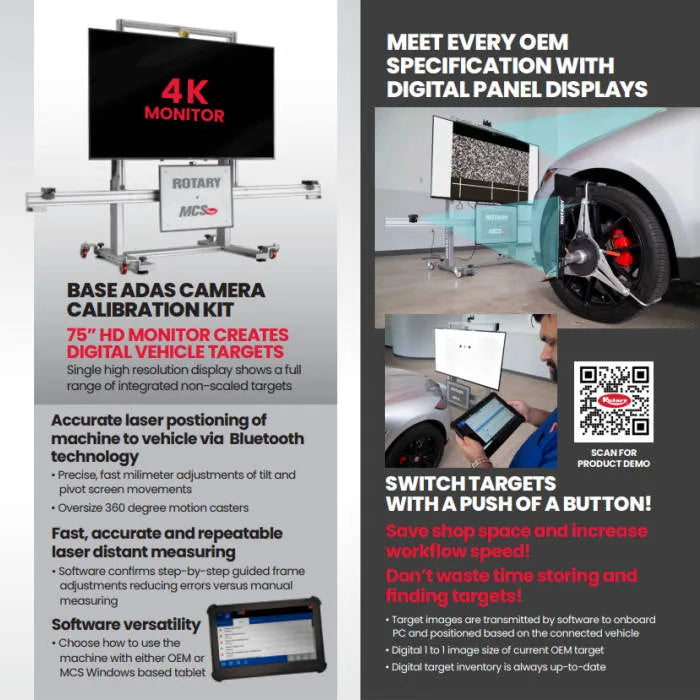 Rotary's new Mobile ADAS Calibration System connects vehicles to a vast, up-to-date digital target library, enabling technicians to transmit, position, and visualize targeted, OEM-accurate repairs on the system's 75" Digital 4K Display at a true-to-life, 1:1 dimension.