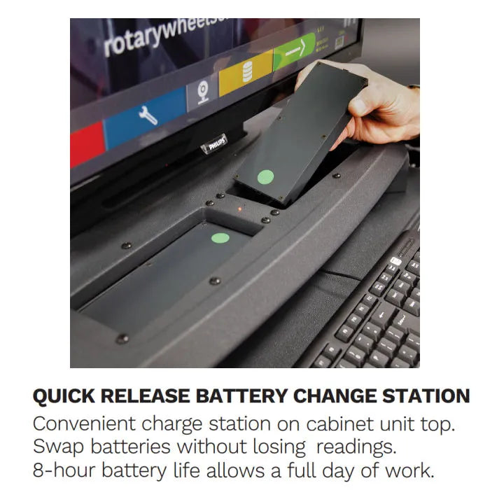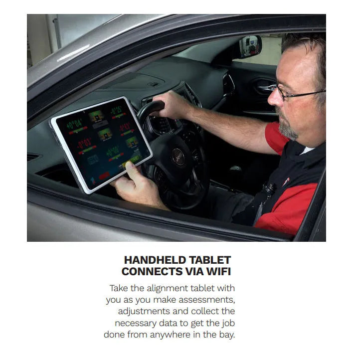 Fast and easy setup with Console or Tablet Operated System - Includes Android Tablet as a Remote indicator. Handheld tablet allows techs to read and make adjustments anywhere in the bay! Easy to follow alignment process with updated graphics that feature a time saving On Rack Test Drive Program