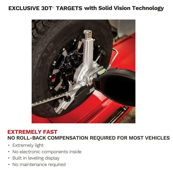 No physical rolling or pushing of the vehicle to make runout compensation. Automatic and instant 3D target visualization. *FOR MOST VEHICLES