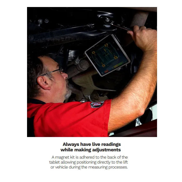 Take the alignment tablet with you as you make assessments, adjustments and collect the necessary data to get the job done from anywhere in the bay. Always have live readings while making adjustments. A magnet kit is adhered to the back of the tablet allowing positioning directly to the lift or vehicle during the measuring processes.
