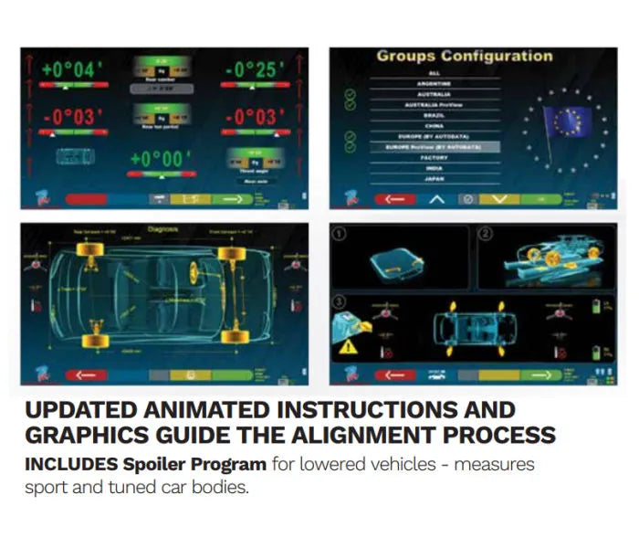 Updated animated instructions and graphics guide the alignment process - includes Spoiler Program for lowered vehicles - measures sport and tuned car bodies.