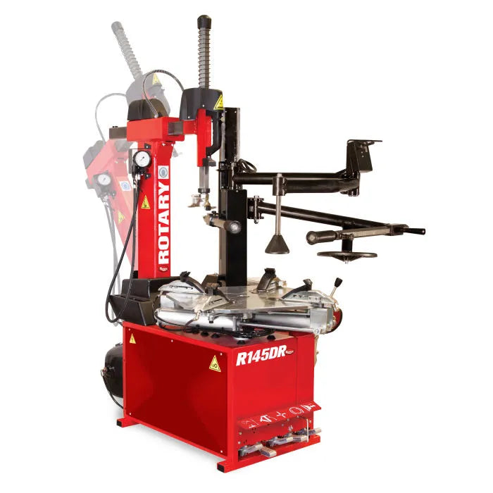 Rotary's R145DR Tiltback VSC Tire Changer is a high-performance, top-of-the-range tire changer model with hand operated double-acting bead breaker cylinder. Extra-wide heavy-duty frame, table inflation system with pneumatically tilting column, the R145DR is designed for low-profile and large-size steel or alloy rims, it works easily on any wheel up to a maximum diameter of 17". The R145DR also features an innovative electric motor inverter, which gives the ability to regulate the chucking table rotation speed to reduce the stress on the bead to avoid any damage to the tire. This tire machine is also equipped with the Fast Inflation (FI) configuration.