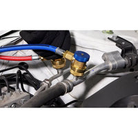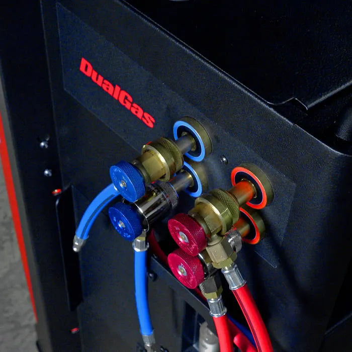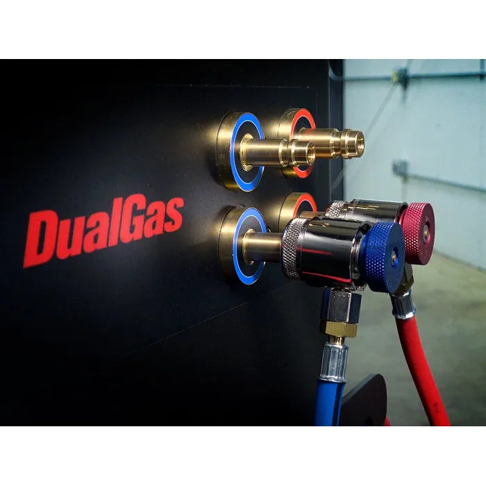 Recharge both R134a and R1234yf refrigerant gas at the same time without changing tanks! Within minutes switch between servicing vehicles with different refrigerants. Quick-connect hoses for each gas type allow gases to be switched out quickly.