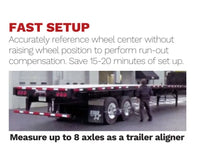 Accurately reference wheel center without raising wheel position to perform run-out compensation. Save 15-20 minutes of set up. Measure up to 8 axles as a trailer aligner.