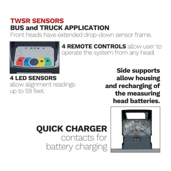 Bus and Truck Application - Front heads have extended drop-down sensor frame. 4 Remote Controls allow user to operate the system from any head. 4 LED Sensors allow alignment readings up to 59 feet. LED Repeater on front sensors. LEDs on the head display when adjustment angle is within specification range.