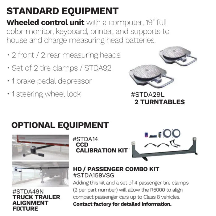 Rotary's R5000HD Commercial Truck Alignment System will produce significantly higher income production with much faster operating times without any loss of accuracy. Choose the R5000HD for your shop and add alignment to the offering of services you can provide today. Suited for larger commercial vehicles, the double inclometer allows caster adjustment without steering. No run out clamps enable the user to skip out of any compensation procedures. This 6-CCD sensor wheel alignment system features infra-red transmission among measuring heads and bluetooth transmission between front measuring heads and control unit. Special side supports allow housing and recharging the measuring head batteries. Portable aligner console can be conveniently positioned anywhere in available bay space.