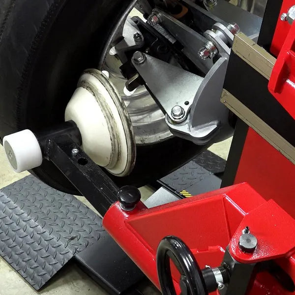 Plastic bead breakers prevent damage to the rim. Adjustable arm positioning allows easy movement of bead breaker to lower drop center in front of the tire. Speedy removal of tire with front and back bead breakers. Quick mounting of a tire to the wheel with the patented bead lever. Aluminum rim protection using attachable braces on hydraulic clamps.