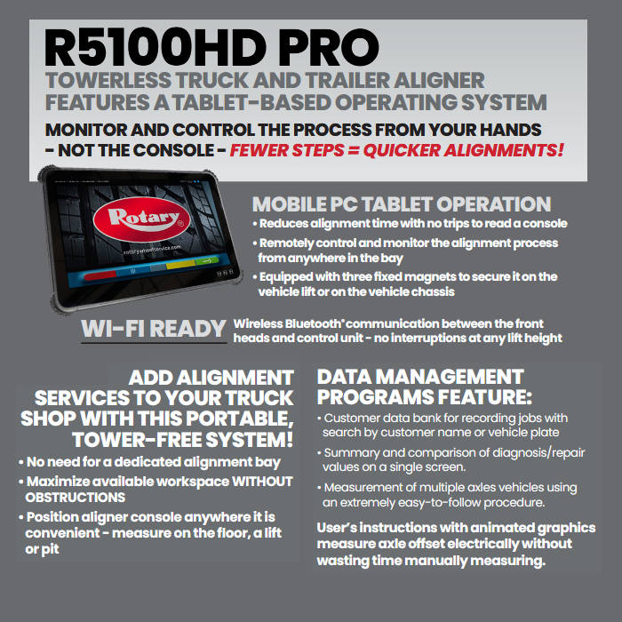 The Rotary R5100HD Towerless Heavy-Duty Truck & Trailer Aligner is a Windows Tablet-Based Alignment System that provides commercial shops with industry-leading precision and efficiency, while eliminating the bay-size requirements of traditional tower-based aligners. Experience precision, performance, and simplicity in one complete solution. The R5100HD is multi-axle ready and was designed to increase productivity, reduce setup time, and maximize available shop space. The R5100HD Pro replaces the R5000HD in Rotary's industry leading alignment offering.