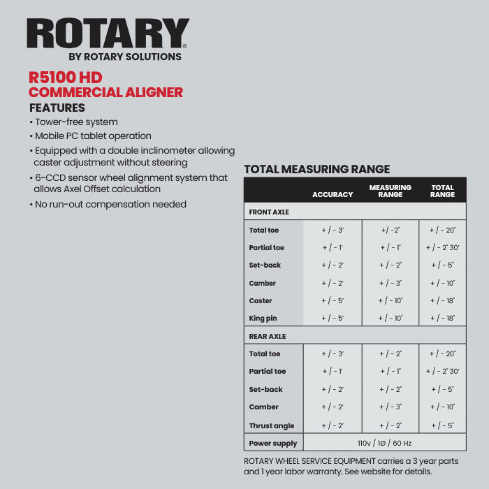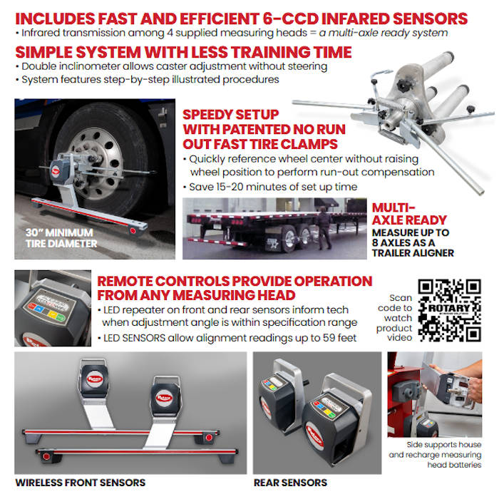 Unlike comparable competitor models, Rotary's NEW R5100HD eliminates the need to purchase additional CCD sensors and clamps to align multi-axle vehicles. The R5100HD's fast, accurate, and easy step-by-step system will guide your techs through the process, utilizing only four CCD sensors, saving your shop time and money.