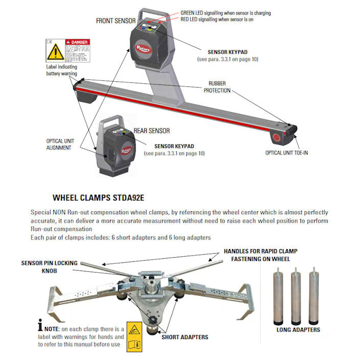 - LED repeaters on front and rear sensors indicate when adjustments are within specification