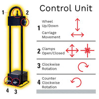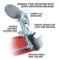 Rotational and carriage control on portable wired stand. Quick manual tool rotation with quick unlocking device.