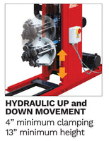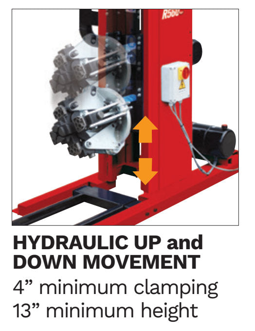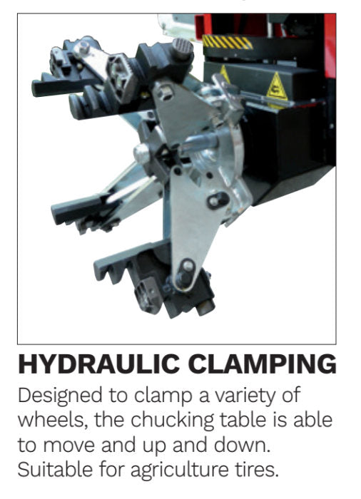 Hydraulic clamping firmly secures the wheel to the tire changer. 4" Minimum Clamping, 13" Minimum Height. Designed to clamp a variety of wheels, the chucking unit is able to move clockwise, counter-clockwise, and up and down.