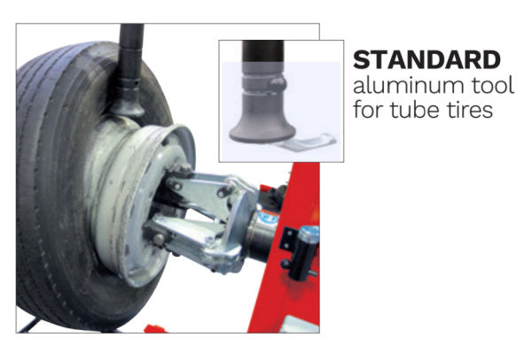Standard roller provides easy setting of tubeless tires. Standard aluminum tool for tube tires. Quick mounting of a tire to the wheel with the patented bead lever. Aluminum rim protection using attachable braces on hydraulic clamps.