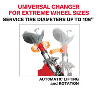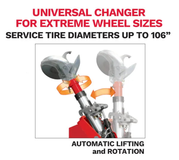 Rotary's R573 Extreme Heavy-Duty Tire Changer allows you to service tire diameters up to 106". The considerable bead breaking force makes mounting and demounting tires effortless. The electro-brake allows immediate stopping of the rotation to avoid any damage to tires. After 5 seconds of the machine not being used, the motor will turn off. The oversized chucking dimensions allow work on larger tires without interference. Reach 50" wheels without extensions or wheels from 51" to 60" with optional adapter set. ELECTRO HYDRAULIC CHANGER FOR TRUCKS,
