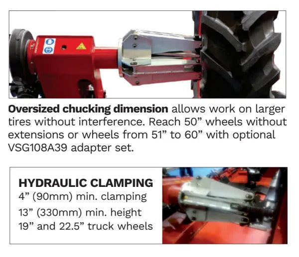 Oversized chucking dimension allows work on larger tires without interference. Reach 50" wheels without extensions or wheels from 51" to 60" with optional VSG108A39 adapter set.