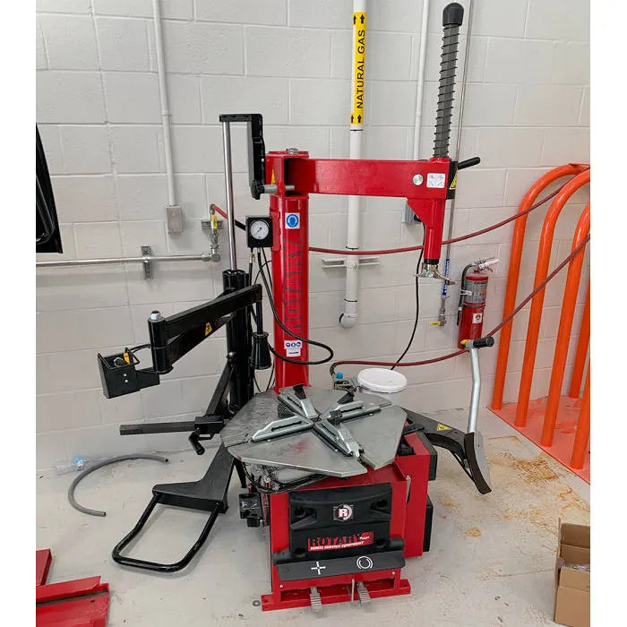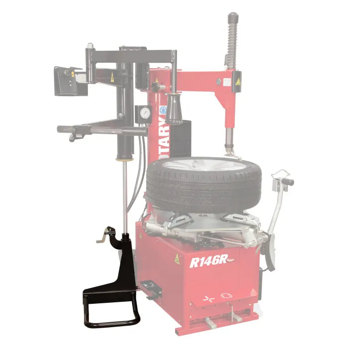 Rotary's hand-controlled R146RAP Swingarm Pro Air Tire Changer with Helper Arm includes an air-driven PLUS91A Helper Arm. This bead top pressing and tire lifting device for large and special tires features a lower bead lifting roller and pneumatic top bead pressing tool. The extra height of the vertical post and tool shaft allows operation on tires up to a maximum of 15" (380mm) tire width. Note: PLUS91A Helper Arm is not installed prior to delivery.