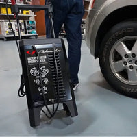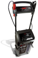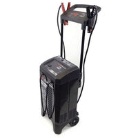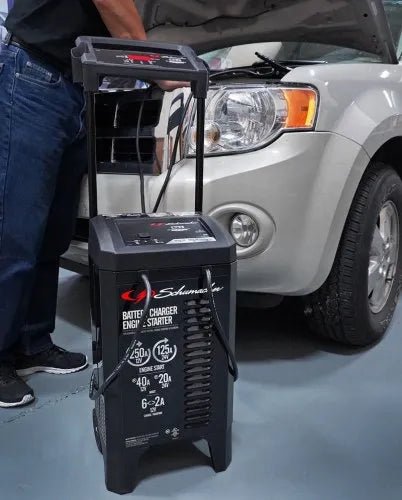 The Schumacher SC1352 Fully Automatic Wheeled Battery Charger with Engine Starter has a heavy-duty transformer that delivers 6–2 Amp trickle charge, 40 Amp boost rate for standard charging and 275 Amp engine starting power.