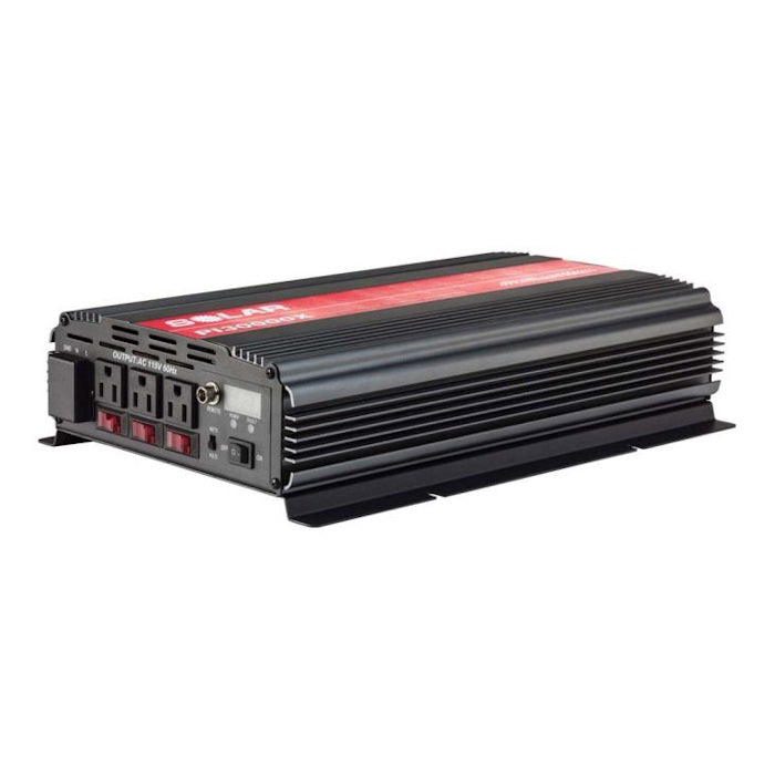 SOLAR Sonic Compression technology ensures stable power delivery throughout the operating range of the inverter to deliver clean, reliable power from a 12 Volt power source to a wide variety of power equipment, tools and appliances. The SOLAR PI30000X features 3 AC outlest, integrated mounting plate, a convenient display providing status of input and output voltage to easily control power demand. Safety features include overload and overheat protection, low voltage alarm and safety shut down for low, or over voltage.