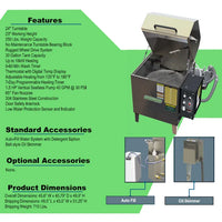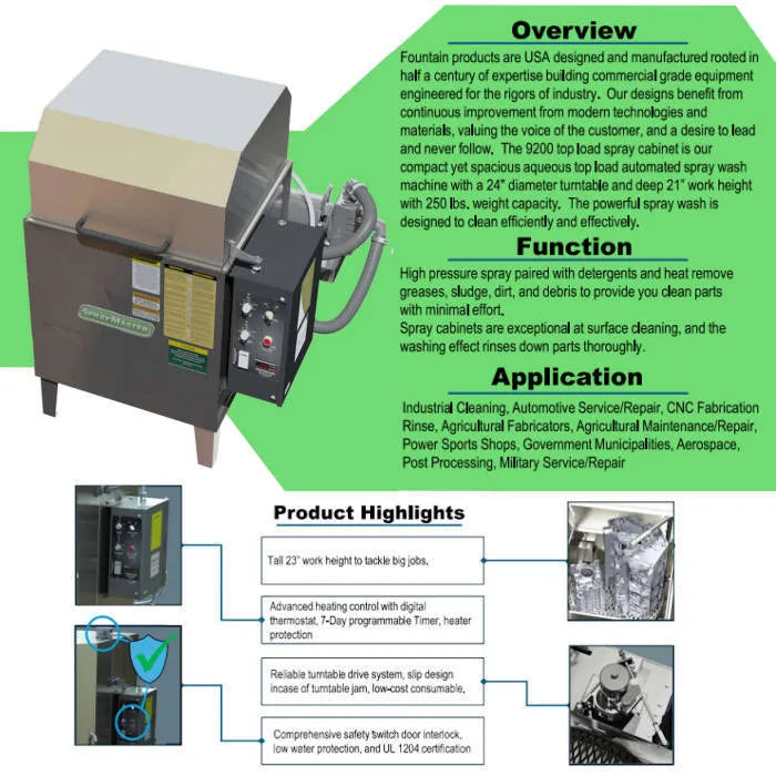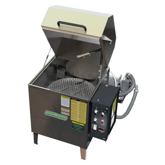 The SprayMaster SM9200 30 Gallon Black Top Load Spray Wash Cabinet is our compact yet spacious aqueous top load automated spray wash machine with a 24" diameter turntable and deep 21" work height with 250 lbs. weight capacity. The powerful spray wash is designed to clean efficiently and effectively. Function