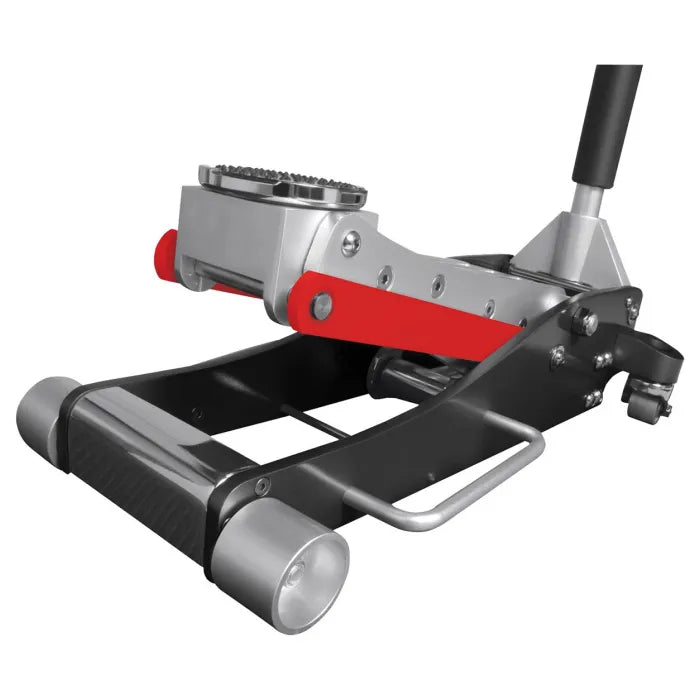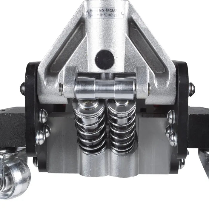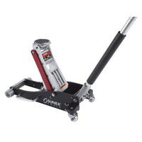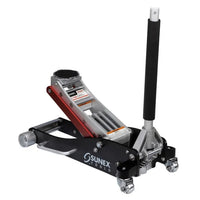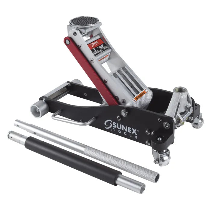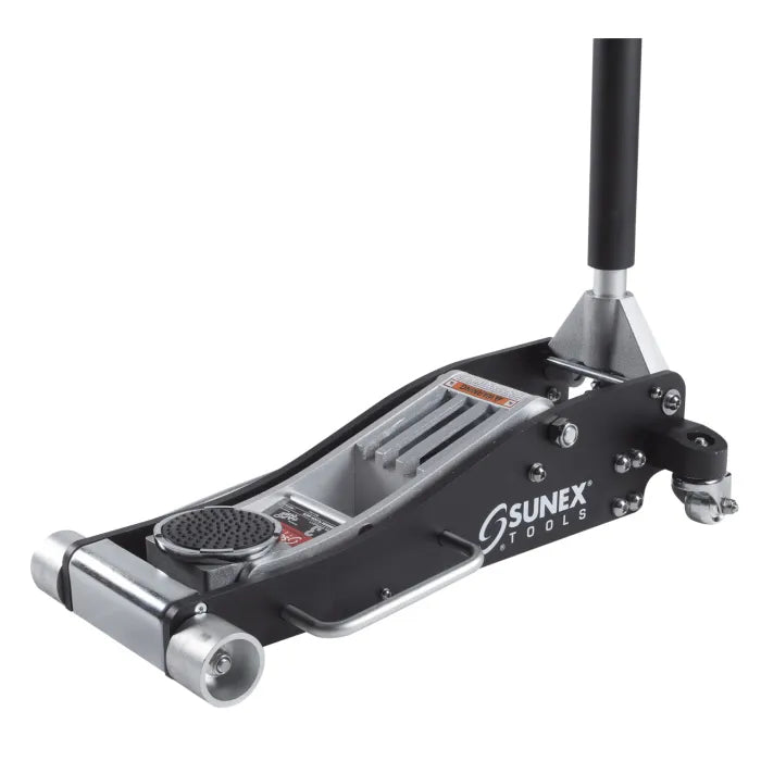 The Sunex Tools 6603ASJ 3 Ton Aluminum Service Jack is the big-brother to the market-leading 2 Ton 6602ASJ. The 6603ASJ features full aluminum body construction and a RapidRise hydraulic power unit with dual pump pistons that reaches max height in only 7.5 pumps of the conveniently stored two-piece 50" handle with quick-lock feature. Side mounted handles, ball bearing mounted rear swivel caster wheels and wide track front wheels allow easy maneuvering and jack positioning. Overload and bypass safety valves protect the jack from overload and over extension while wiper seals protect the hydraulic system from contaminants. Rubber saddle pad and foam bumper handle protect the vehicle.