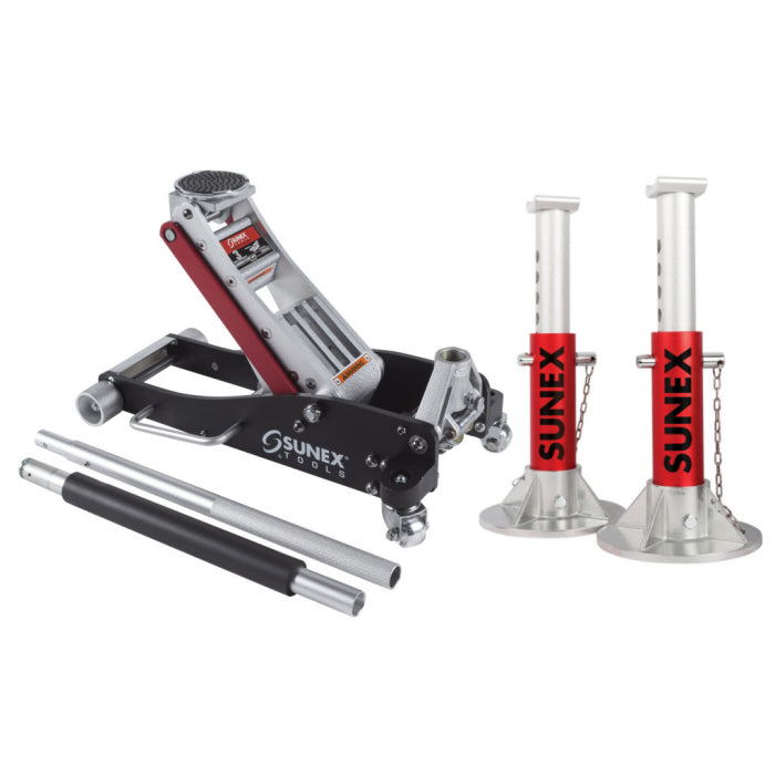The Sunex 6603ASJPK 3 Ton Aluminum Jack Stand Service Jack Pack includes the best-selling Sunex 6603ASJ 3 Ton Aluminum Service Jack and a pair of Sunex 1003ASJ 3 Ton Aluminum Jack Stands in one ultra-lightweight jack pack. The 6603ASJ features full aluminum body construction and a RapidRise hydraulic power unit with dual pump pistons that reaches max height in only 7.5 pumps of the conveniently stored two-piece 50" handle with quick-lock feature. Side mounted handles, ball bearing mounted rear swivel caster wheels and wide track front wheels allow easy maneuvering and jack positioning. Overload and bypass safety valves protect the jack from overload and over extension while wiper seals protect the hydraulic system from contaminants. Rubber saddle pad and foam bumper handle protect the vehicle. The 1003ASJ jack stands feature full aluminum construction, six locking positions, and a heavy-duty flanged base.Ultra-Lightweight Jack Pack Includes: (1) Sunex 6603ASJ 3 Ton Aluminum Service Jack and (2) Sunex 1003AJ 3 Ton Aluminum Jack Stands
