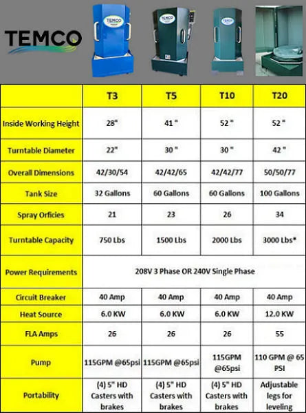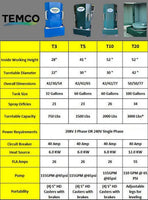 The TEMCO Industrial Parts Washers Model T-5 Spray Cabinet was designed with the operator in mind with its heavy duty simple and rugged design. The T-5 is used extensively in the automotive and transmission rebuilding industry. The T-5 has also evolved into the most versatile of TEMCO's Industrial Part Washer products.The large working area, 30" turntable and 41" working height of the T-5 gives it the ability to handle large industrial part washing tasks as well as small parts cleaning tasks. The model T-5 has proven itself as the premier aqueous cabinet parts washer in the industry today.