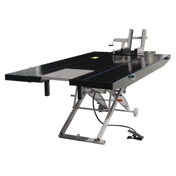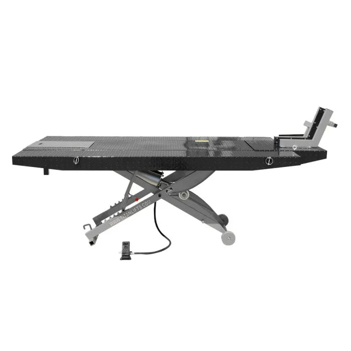 The Titan Lifts SDML-1000D-XLT Motorcycle ATV Lift comes fully equipped with front tire vise, front extension and side extensions which gives it a large enough platform to work on everything from motorcycles and ATVs to jet skis and snowmobiles. This heavy-duty diamond plated lift can handle up to 1,000 pounds with its 7" air powered cylinder which raises the extra-large platform up to 33".