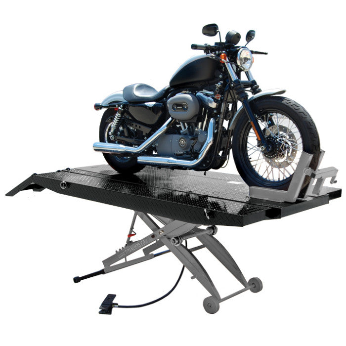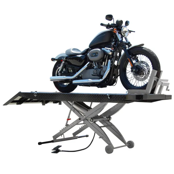 The Titan Lifts SDML-1000D-XLT Motorcycle ATV Lift comes fully equipped with front tire vise, front extension and side extensions which gives it a large enough platform to work on everything from motorcycles and ATVs to jet skis and snowmobiles. This heavy-duty diamond plated lift can handle up to 1,000 pounds with its 7" air powered cylinder which raises the extra-large platform up to 33".Are you looking for an affordable motorcycle / ATV and other equipment lift platform that will hold up over time? We've seen so many of these products out there over the 20 years we've been in business that just won't hold up to daily use. Well this one won't disappoint you. Titan is known throughout the industry for their quality, and this lift table is the perfect example. Plus, it includes all the popular accessories that typically cost extra. Comes complete with side extensions, front extension, wheel vise, removable extended approach ramp, drop out panel for the rear wheel, and it's totally portable. Just hook up shop air, and you're ready to roll! So check out the specifications below and give us a call with any questions.