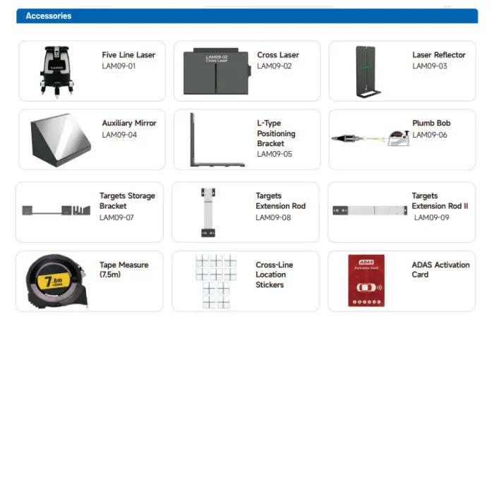 This tool utilizes a 5-line laser device and a cross-line laser for precise alignment. The 5-line laser quickly locates the vehicle's center line and provides multiple reference points, while the cross-line laser ensures the main calibration frame is accurately placed. Together, they guarantee optimal ADAS system performance, enhancing safety and reducing calibration errors.