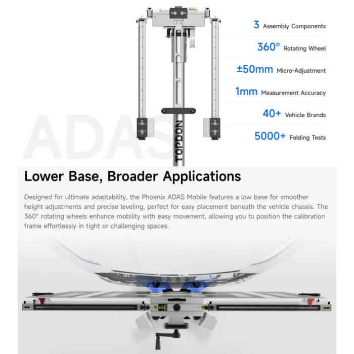 The TOPDON Phoenix ADAS Mobile Deluxe Package B empowers professionals to work on more modern vehicles with ease and precision. TOPDON's Phoenix Mobile ADAS is a foldable calibration frame that offers unmatched portability and convenience, making auto shops even more productive and profitable. Compatible with TOPDON's Phoenix Series of diagnostic scanners, this device gives professionals the capability to provide needed work on the most modern cars.This is a must-have tool for professional collision shops, components, and parts specialists, as well as any auto body shop that provides services such as window, trunk, and hood replacement, alignment and suspension, and many other repairs on modern cars.