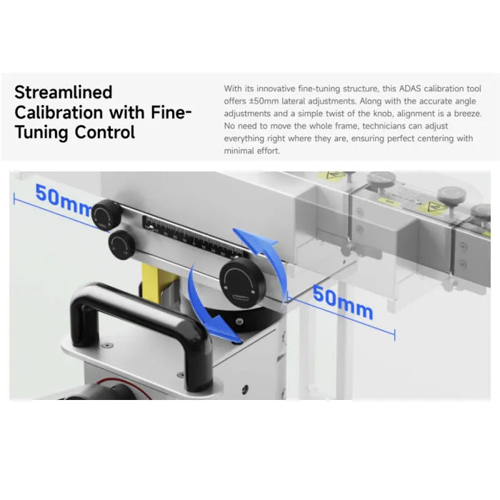 With its innovative fine-tuning structure, this ADAS calibration tool offers ±50mm lateral adjustments. Along with the accurate angle adjustments and a simple twist of the knob, alignment is a breeze. No need to move the whole frame, technicians can adjust everything right where they are, ensuring perfect centering with minimal effort.