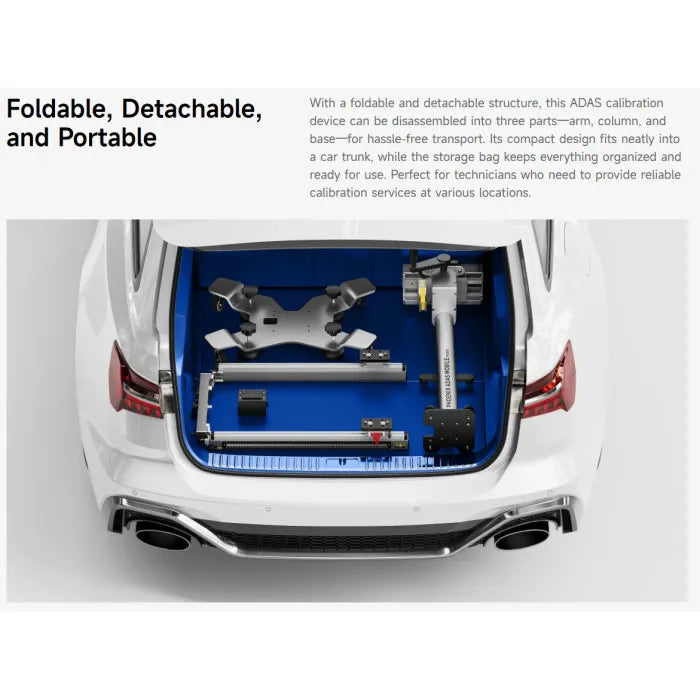With a foldable and detachable structure, this ADAS calibration device can be disassembled into three parts - arm, column, and base - for hassle-free transport. Its compact design fits neatly into a car trunk, while the storage bag keeps everything organized and ready for use. Perfect for technicians who need to provide reliable calibration services at various locations.