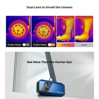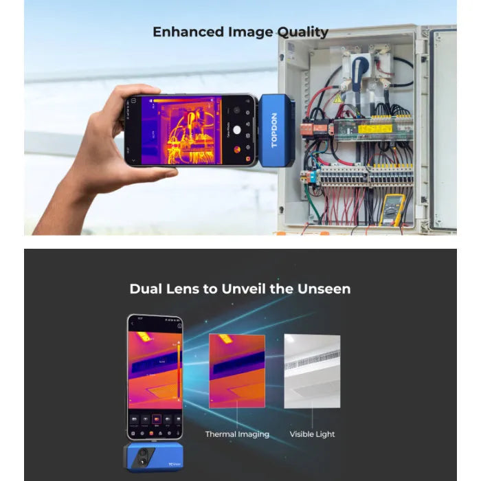 The TOPDON TC001 Plus is a portable camera that turns your Android smartphone or Windows laptop into a powerful infrared thermal imager. Experience exceptional visuals with TC001 Plus, a dual-lens thermal imager designed to unveil hidden details, so image contours of objects such as circuits and pipes can be easily recognized. Sporting an impressive 256 x 192 IR resolution and an additional 1MP visible light lens, paired with the cutting-edge image fusion technology, TC001 Plus captures targets in original colors for overall precision. Compact and portable, it is ideal for home inspectors, HVAC technicians, electricians, automotive technicians, and even farmers looking to protect crops and livestock.