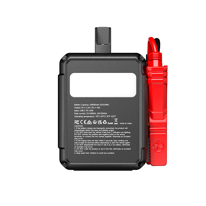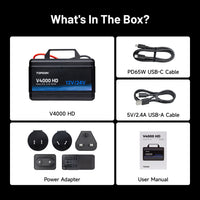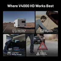 The V4000 HD features a 204.8Wh LiFePO₄ battery designed to support true 24V starting, delivering up to 30 starts at 24V for heavy-duty trucks, buses, and commercial equipment. At 12V, it provides up to 60 starts for passenger vehicles and light-duty applications. Fast USB-C PD (65W) charging restores full power in just 3.5 hours, keeping it ready for demanding jobs.