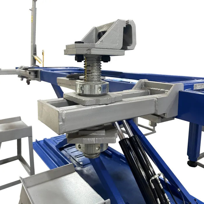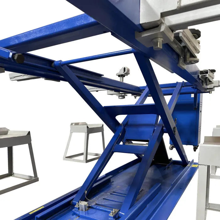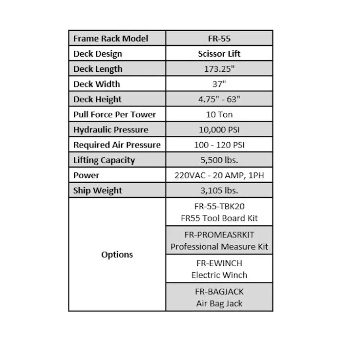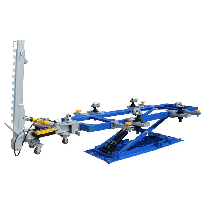 The iDEAL FR-55 Scissor Lift & Frame Rack is unique, high quality, compact frame straightening machine with the versatility of an automotive lift, designed to service full-frame or uni-body type vehicles with its 5,500 lbs. lifting capacity. It incorporates a 10 ton 'multi-angle/adjustable height' pull tower with 360 degree pulling capability, along with adjustable height. Clamping assemblies and universal positioning swivel arms & lift pads. The FR-55 also comes standard with pull chain with hook and wheel stands.