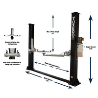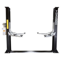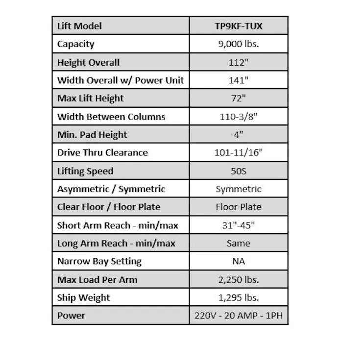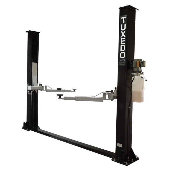 The Tuxedo TP9KF Symmetric Floor Plate Two Post Lift is an economy designed open top / floor plate vehicle lift with standard lift features including: symmetrical swing arms, low profile 4” lifting pads, stackable height adaptors, saddle pad adaptors and dual point carriage lock releases. The one piece column combined with reliable chain drive cylinders makes it the perfect service lift for passenger cars, light duty trucks & most SUVs. The automatic arm restraints and durable powder-coat finish provide an economically priced lift with all the features, all for a great value! Limited Time Offer - Huge Sale!