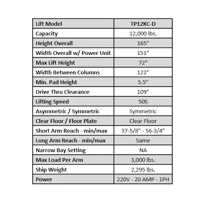 - Capacity: 12,000 lbs.